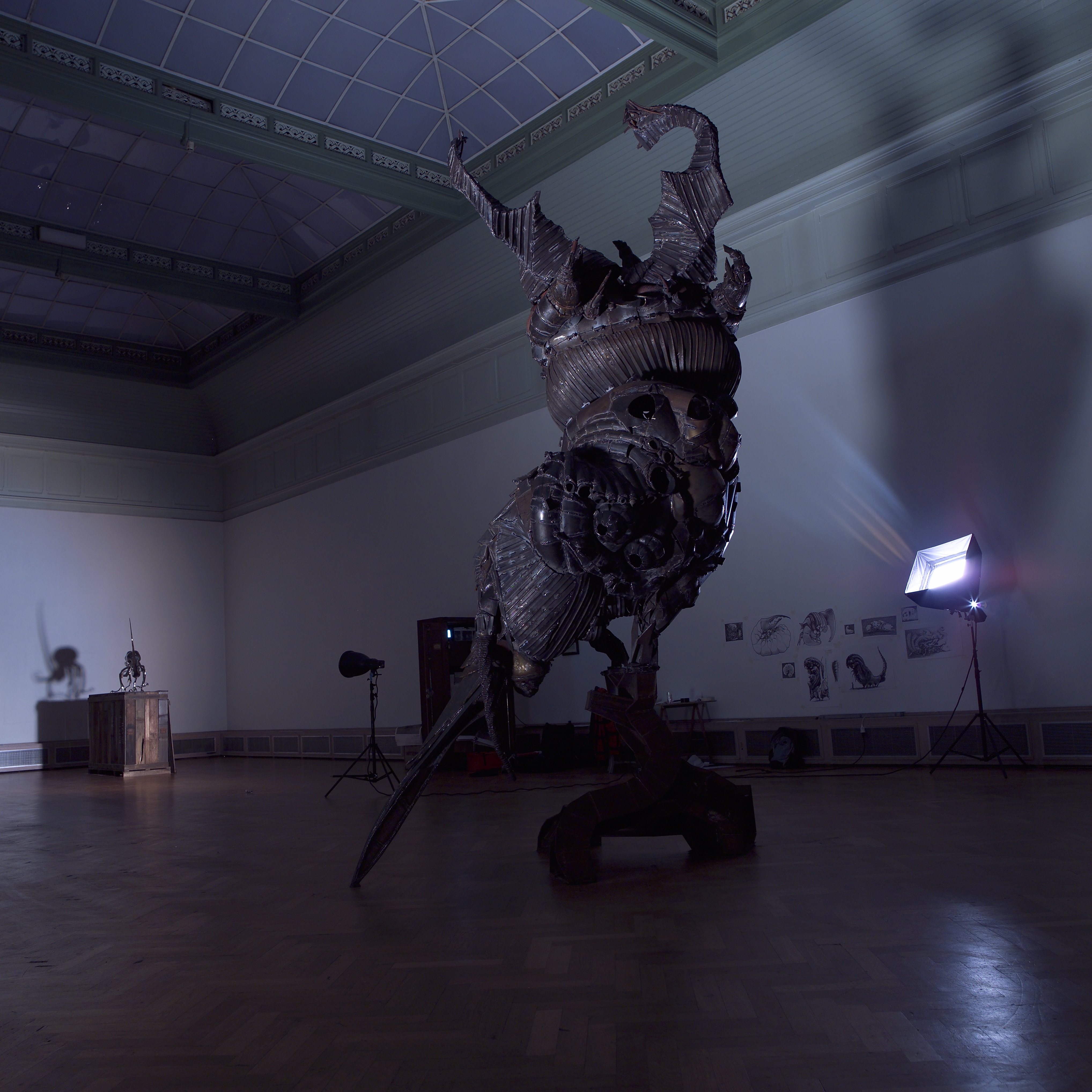 Larve, Mother of all insects, Metamorphosis. (2005) This sculpture is composed out of different body parts from various insects, constructed form pieces of scrap from various processes. This became a mythical creature that tells the story of evolution. The amorphous sculpture represents personal development; like an art piece, the artist is never finished.