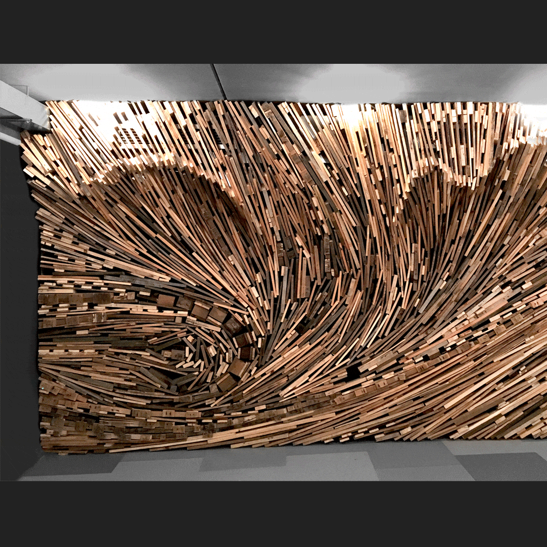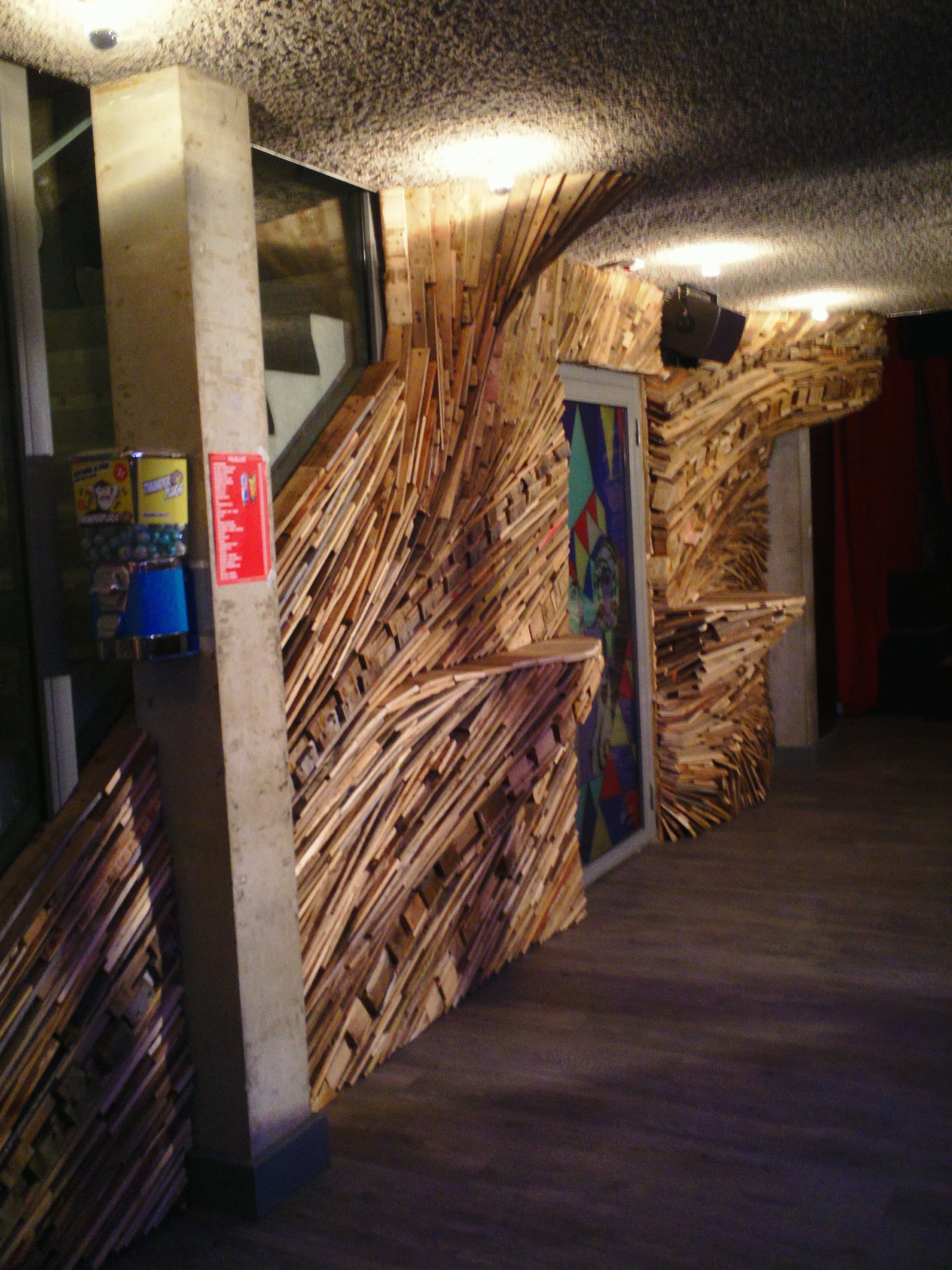 Total surface area of the wall is about 50 square meters. The amount of material used was four cubic meters of scrap pallets and 8000 screws. The use of residual material gives the work a sustainable nature.