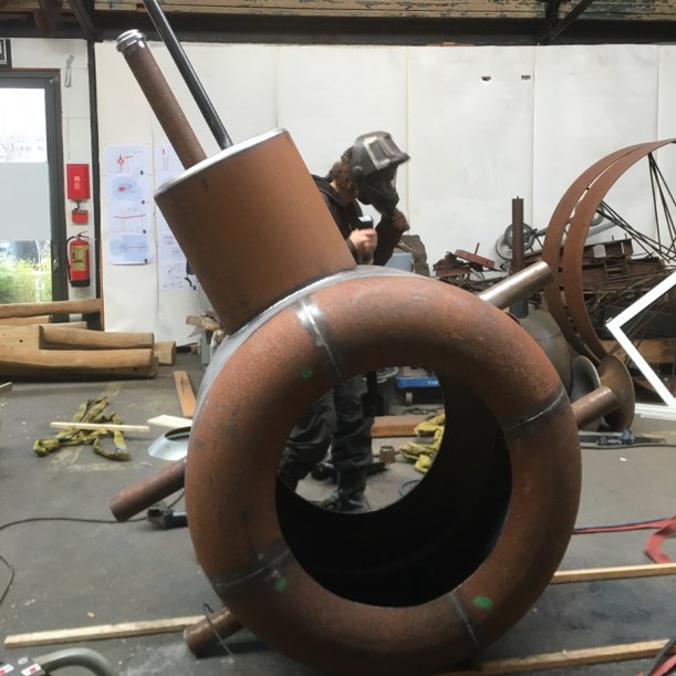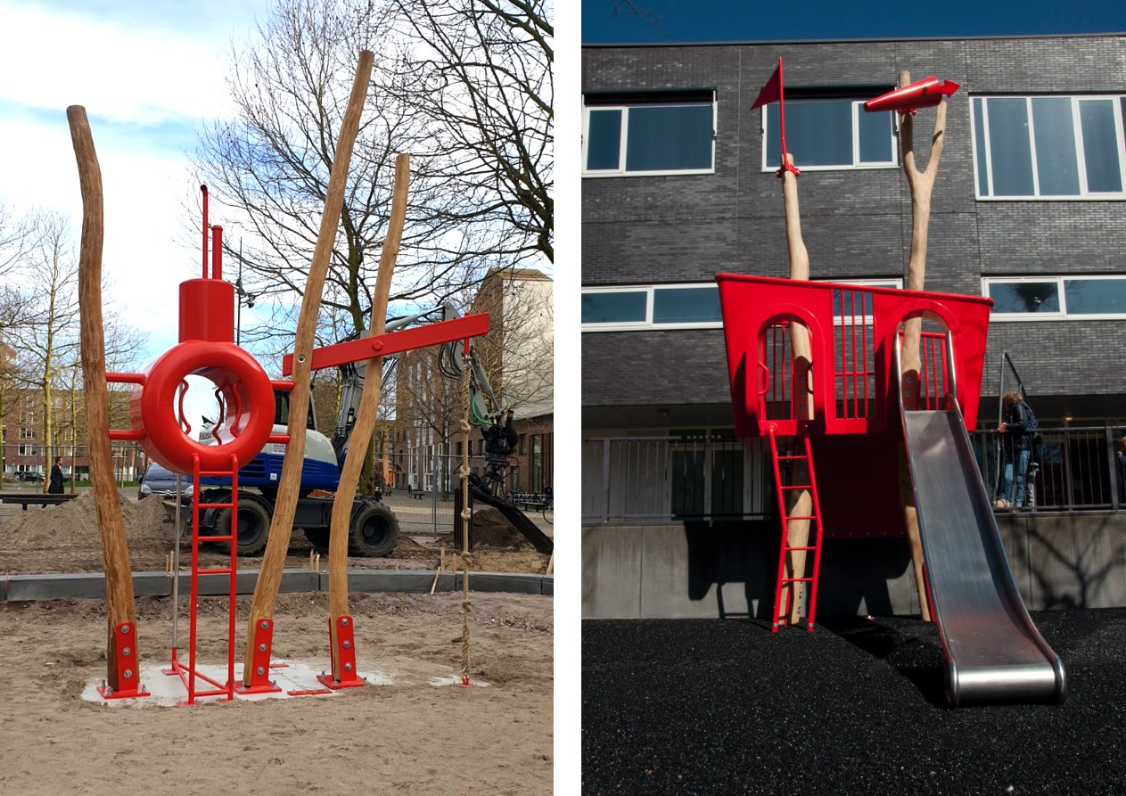 The playground form a diagonal line through the park. The nautical history of the location inspired us: trees are placed like mooring poles, the bright red objects are bobbing along a imaginary water surface