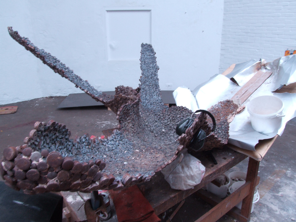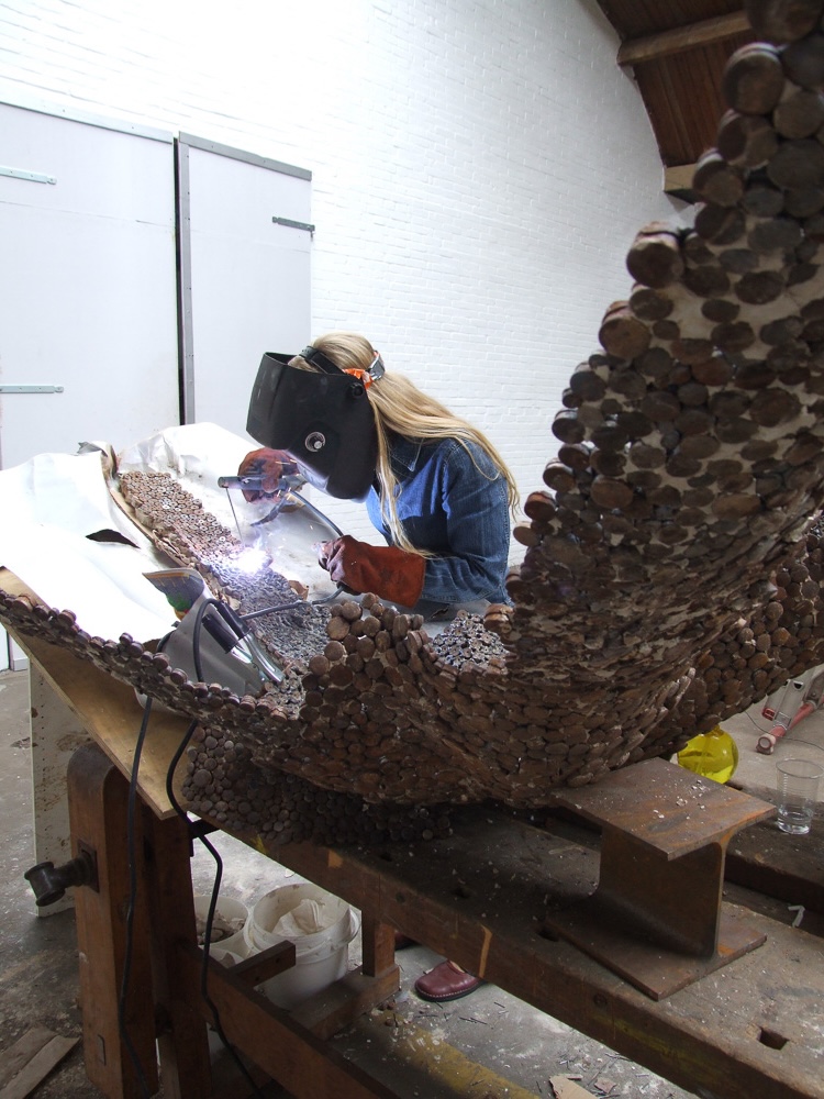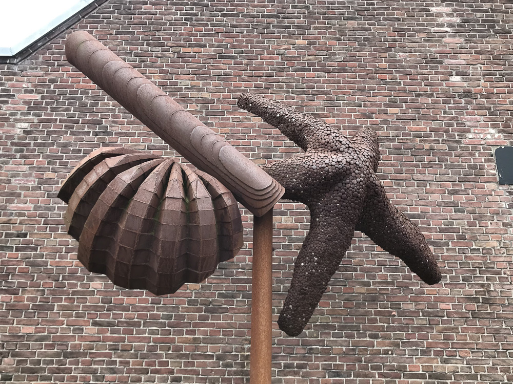 Evolutionair gezien komt al het leven uit de zee. Schelpen en fossielen zijn een oer-oude herinnering hieraan. Schelpen vormen voor mij een universeel beeld van de vrijheid die mensen ervaren op het strand. Mijn beeld “Stil even”, is een compositie van zeedieren. Die ieder een ander patroon dragen, ontstaan door een herhalende handeling. Zo is de zeester samengesteld uit honderden aan elkaar gelaste nippels, stukjes stansafval.