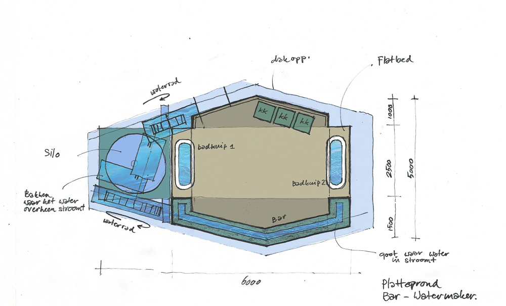 Een bar waarbij het water centraal staat. Het stroomt langs, over en door de bar heen, startend bij een silo, via een waterrad door bakken en over het bar blad. Een unieke waterbar die als machine gaat fungeren: een Water Maker. De bezoeker en het personeel zal het element water zo levensecht ervaren. Het uitgangspunt is om te werken met hergebruikte materialen en objecten. Kleuren zijn variërend door de verscheidenheid aan materialen.